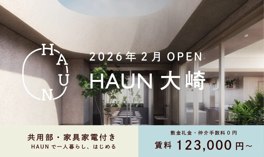 HAUN株式会社は、都心近接の大崎・五反田エリアに、コリビング賃貸住宅「HAUN 大崎」を2026年2月1日に開業します。天然木や自然光を活かした空間デザインと、引越しコストや手間を最小限に抑える工夫により、忙しいビジネスパーソンにスマートで心地よい都市生活を提供します。 -