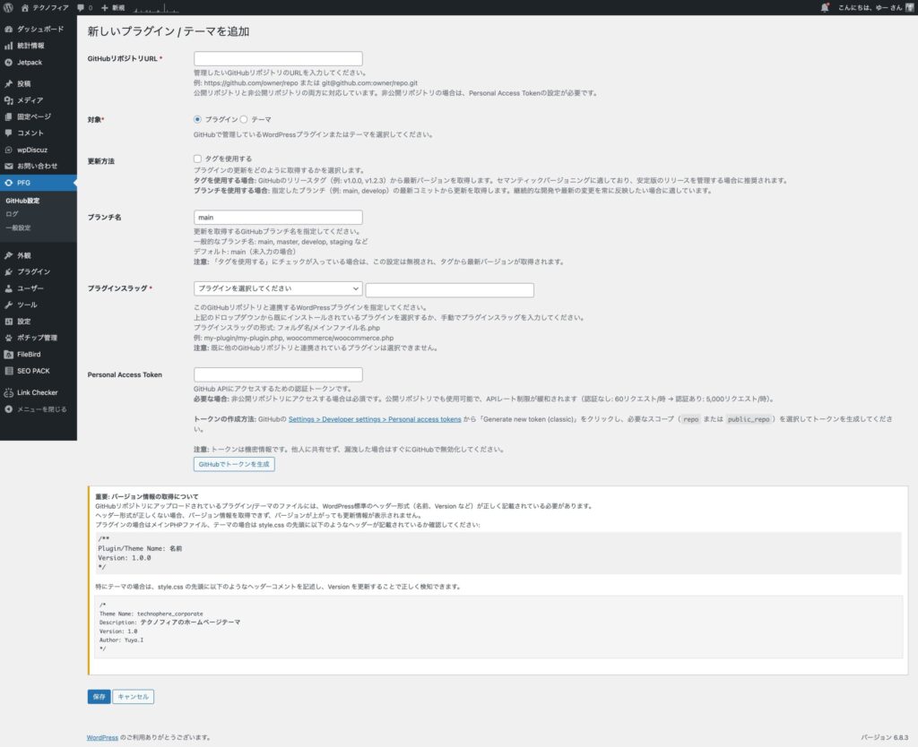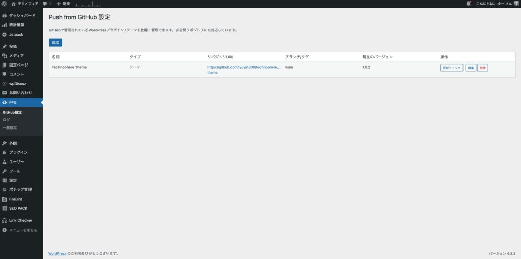 WordPressの管理画面左側に「PFG」が表示されるので、そこから、GitHub設定から追加を押してください。