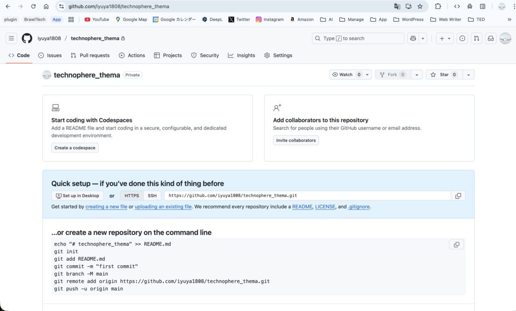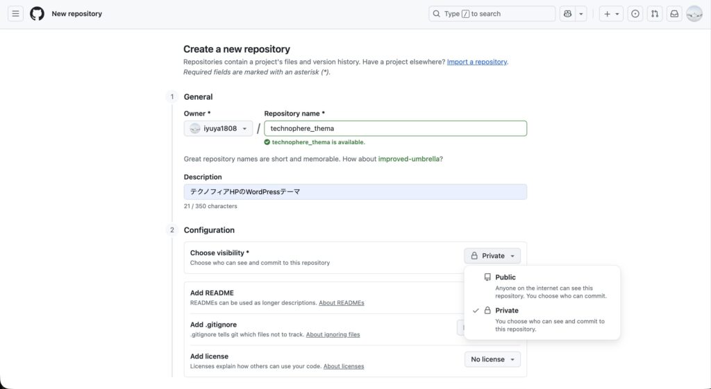 リポジトリ名は technophere_thema など、テーマ名がわかりやすいものにしましょう。公開範囲(Public/Private)はプロジェクトに応じて選択してください。