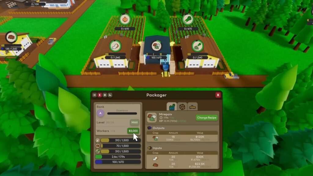 作物を植え、収穫し、畑から工場へ運び、レシピに加工してから販売用に配送し、収益を得るというサイクルを回していきます。