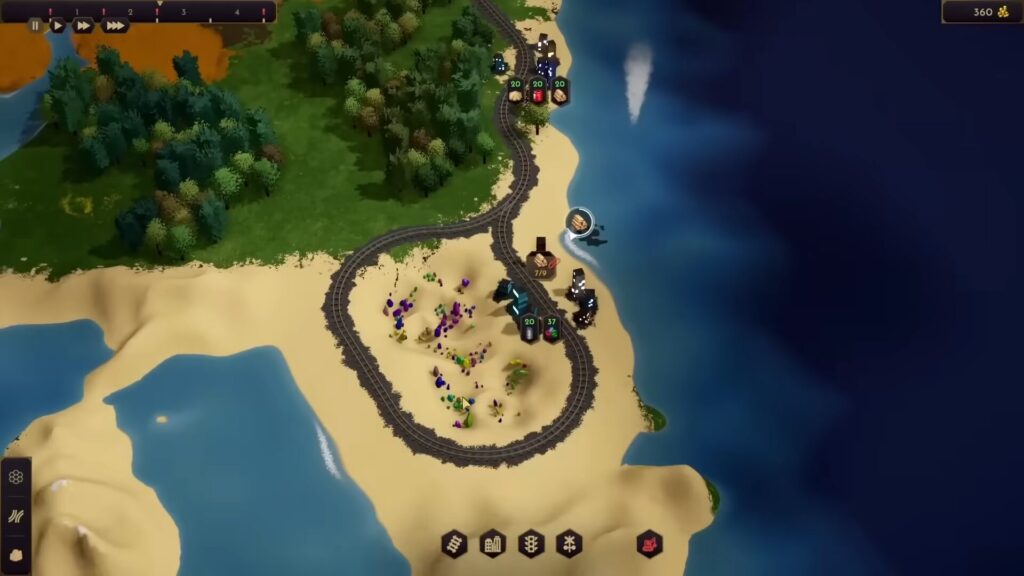 レールを敷設して接続を作り、信号機で列車ルートを制御し、必要な資源を時間内に届ける必要があります。